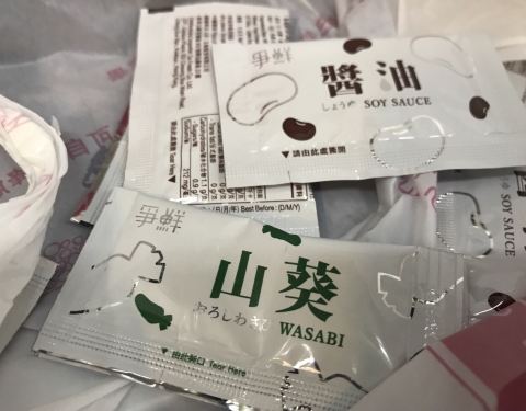 外带回家自己吃,可以选已经拼好的,也可以自己挑选,所有的寿司都是三元一个,香港配送的芥末酱叫黄葵,酱油味道超级鲜甜,非常好吃。