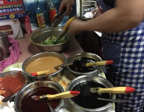 厦门几大有名的麻辣烫,松柏麻辣烫算一个,不清楚开了多少年,但是89年小伙伴表示从小就在吃他们家了。 位于屿后南里,靠近京闽酒店。下午五点开门,卖完就收,虽说是做宵夜,但生意好时10点就可能没啥料了。 居民区一楼,就开在楼梯口左侧,店内一侧摆着食材,阿姨大叔在另一侧煮炸拌,客人都是坐在店外。菜品自选完取一个自己想要的号码,夹在篮子上放着排队。菜品都是一般麻辣烫常出的,豆制品、蔬菜、鸭血等是煮的,肉类、丸子类用炸的。去的偏晚,米血已经没有了,据说很好吃,等餐的时候,远远就闻到花生酱的香。 这家的拌酱以花生酱为主,辅助一些酸咸辣,煮的菜品口味是我吃过麻辣烫里最清淡,油腻感低,吃着很舒服的。泡面裹着花生酱十分香甜,加一点汤底湿润口感更好,鸭血嫩柔,腐竹豆皮西兰花之类的都很不错还有点清爽,煮过的香菜特别好吃。 炸的入鸡腿肉串等就中规中矩,有点过头略干,炸馒头香脆好吃。 整体来说偶尔吃吃还不错。 这家没有固定休息日,扫码付款的时候有提示,休息时间参见老板的朋友圈,朋友就吃过两次闭门羹,老板任性不是一点点。