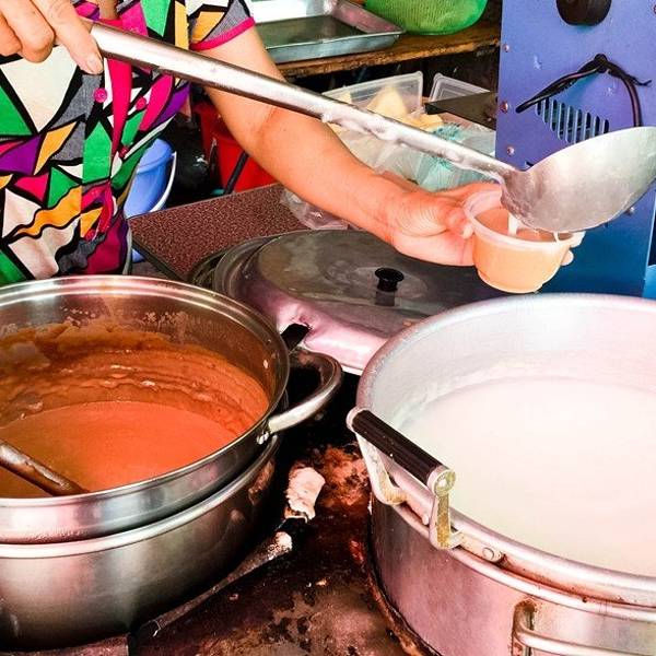 杏仁茶和芝麻茶都是源于潮州府城,也就是现在的潮州市,就是大都是小贩挑一副小担,摆一小牌,或者是在担上书写“杏仁茶”、“芝麻茶”的字样,摆卖于路口小巷边,让路人于小桌旁坐下慢慢品味。小贩挑担卖杏仁茶和芝麻茶,两头各备一锅,下面生煤炉,上面置一筒形圆锅,外面用竹皮包扎隔热,又镶上有花纹的黄铜皮,很是清洁美观,使人一见就有好感,此情此景,真有点古城风韵。杏仁茶、芝麻茶味道浓香,独具风味,令人回味无穷,值得一尝。
