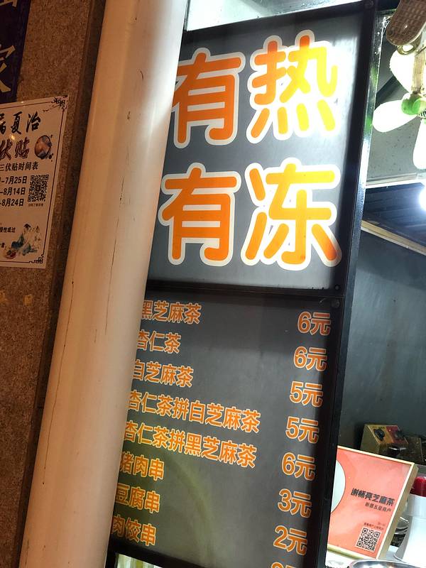 特意开车来喝的杏仁茶和芝麻茶,生意确实很好。 靠近潮州西湖的南门,远远的就看到招牌。 左边是点餐制作和出餐的地方,下午四点左右来已经排了五六人的小队,点餐的阿姨负责记录收钱找钱发号和装茶,旁边一个大叔在炸串。东西很简单,杏仁茶,黑白芝麻茶,肉串,饺子串和豆腐串;价格也很便宜,芝麻茶6块,杏仁茶5块,炸串都是两块。 右边是用餐的地方,点了餐端着盘子坐在这边,如果点了串就会分个号码等隔壁叫。很多都是本地人来吃,点餐和叫号都是用潮语。 杏仁茶冰的很甜,热的黑芝麻茶就是芝麻糊,很香不甜腻,冰的偏甜一些,夏天喝起来很爽。但是个人还是喜欢都喝热的,比较香。炸串最好吃的是豆腐,油香;饺子串有点像炸馄饨。
