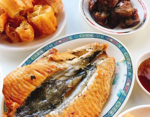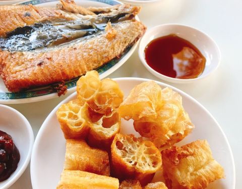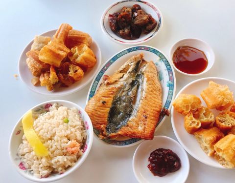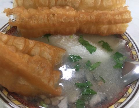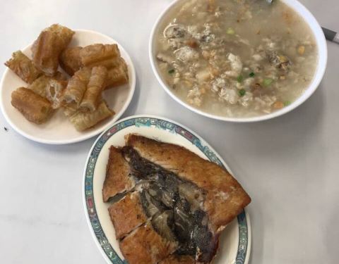 走了20分钟,一路上都没啥人,结果一到阿堂咸粥,发现所有人都在这里吃早饭,综合咸粥份量超级大,爸爸还是吃鱼肚和虾仁饭,油条香肠也美滋滋