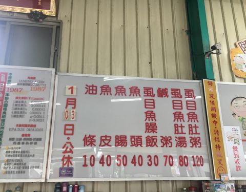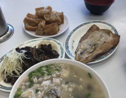 特地起早去吃的,5、6点的样子到那边,周围黑灯瞎火的,发现已经有很多当地人在吃了。 粥里面鱼肉很多,很鲜美,想点油条的,可惜油条还没到,就点了香肠配粥,台湾吃到的香肠都不错,里面都是肉。热乎乎的一碗粥...特地起早去吃的,5、6点的样子到那边,周围黑灯瞎火的,发现已经有很多当地人在吃了。 粥里面鱼肉很多,很鲜美,想点油条的,可惜油条还没到,就点了香肠配粥,台湾吃到的香肠都不错,里面都是肉。热乎乎的一碗粥下肚很舒服。 吃完天才开始亮起来,这才去拍了招牌。