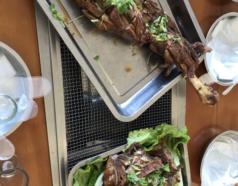 距离上次吃烤全羊已经是很久以前的事情了。再次来吃这家店已经换了地方。我们十几个人要了一份60斤的烤全羊和一份烤羊腿加羊排,还有羊杂汤锅、凉面和素菜赠送。羊肉不腥味道还可以,最喜欢吃脆的羊皮和肚子那边。就是吃的多了,感觉口渴,调料味有些偏重,分量还是可以的,我们最后都没有吃完。