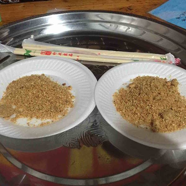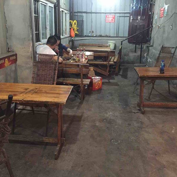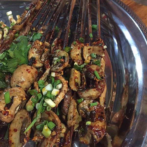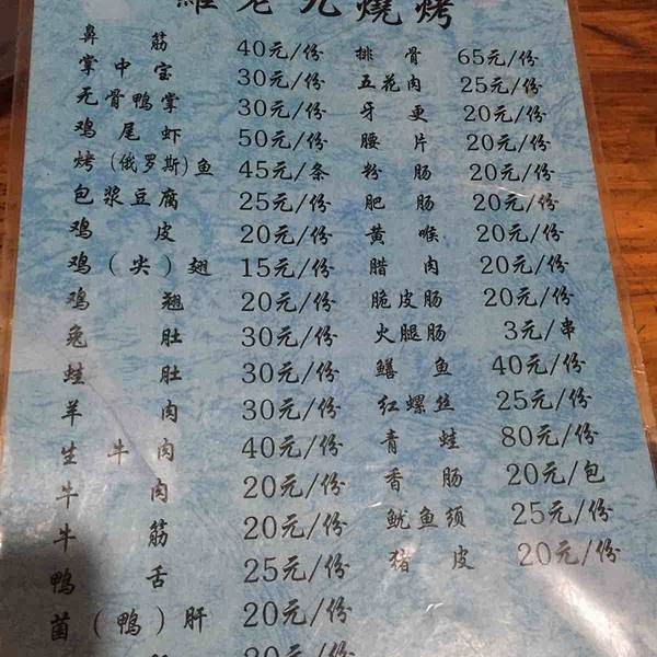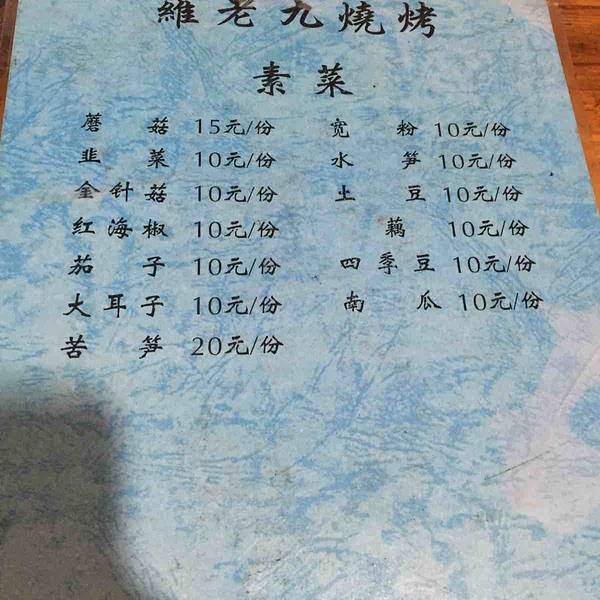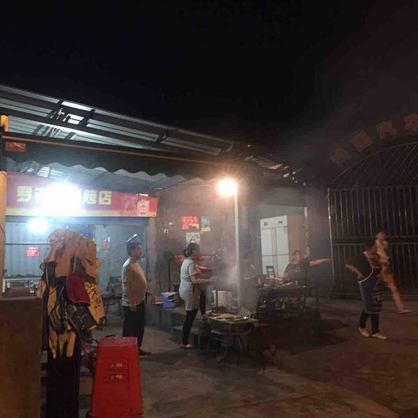 宜宾的烧烤是很出名的,给大家推荐的这家罗老九烧烤就是在宜宾当地的老字号烧烤。罗老九烧烤是宜宾开了很多年的一家烧烤了,最开始开在宜宾洞子口菜市那里,洞子口以前也是宜宾烧烤的聚集地,后来拆迁了就搬到上江北来了。烧烤店位置还不好找,在上江北五粮液大道旧州路,有个宜宾二医院旁边的路口,要一直往前走,走大概5分钟就看到一家烧烤摊就是了,而且走的那个路口很黑,没有路灯,一个人走的话还是要小心点。第一次来的话不容易找到,位置有点偏。位置偏也丝毫不影响这家店的名气和生意,来的时候差不多都坐满了,店铺对面的路边上都加着有桌子。店铺的环境确实很简陋,几张矮桌子,没有任何的装修,水泥地,门口就是烤烧烤的地方,几个老板在一起烤,还有一个大风扇,没有空调,夏天来这里吃估计还是很热的。桌子上的油责还比较多,谁叫别人家味道好啊,来吃的人还真不少。首先说说烧烤的蘸碟,是干的黄豆面,加辣椒面,加花生面放在一起的,烧烤配上这个酱都要香很多。菜品推荐的有:烤肥肠,20元一份,一份10串,份量比较少,一根签上的肥肠没多少,前几次来吃的肥肠都还可以,但是感觉这次不怎么咬的动,有点老了,但是味道还是不错,烤的入味,喜欢吃肥肠的话一定要点一份。烤香肠,20元一份,是宜宾特产的天味小香肠,这种小香肠无论是烫火锅还是烤烧烤都很好吃,很细一根,烤出来很焦脆,外面脆脆的,吃起来带甜味。烤腰片,20元一份,一份也是10串,烤出来很难嫩,没有腥味,自己是不怎么喜欢吃腰片的,但是都觉得腰片确实烤的不错。烤鼻筋,40元一份,有点贵,但是也是必点菜,烤出来吃起来很有弹性,比烤的牛筋要好吃,主要吃吃起来是焦脆的。烤牛肉20元一份,一份10串,牛肉还是比较嫩,但是还是一根签上没什么牛肉,份量比较少。烤的素菜也挺不错:烤藕片,10元一份,藕切的很薄,烤起来很入味,吃到嘴里脆脆的。烤宽粉10元一份,也是宜宾特有的宽粉,记得小时候就有很多卖炸宽粉的地方,现在都没有了,确实吃起来很怀旧。烤蘑菇,15元一份,是圆蘑菇切成片烤出来的,味道比一般的平菇要好吃。烤茄子10元一份,是一政只茄子,里面的调料加的很多,所以味道就很重,也不错。整个罗老九烧烤就是位置很偏,不好找,环境简陋,就是一般的烧烤路边摊,但是味道不错,不愧是几十年的老字号了,价格偏贵,如果要喝酒的话人均消费在100元左右。