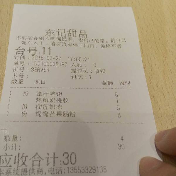 某天经过的时候发现东记重新装修过了,店面增加了许多小清新的元素,感觉夏天又到了。招牌变成可爱的字体,外墙变成绿色,里面装修也刷了新墙面。刚好过了人多的时间点,所以店里的人不算多,不过也坐了有大半。排队的时候稍微混乱了一点,因为这家店是家庭经营,所以收银员不太专业,导致人多的时候某些人根本不排队。一半是有椰汁的粉皮,一半是原味的,里面的芒果很大块,酸酸甜甜很适合夏天吃。这个还好,不会很甜,适合我的口味。榴莲肉就那么一点在上面点缀,里面的奶冻几乎没有什么榴莲味。这个蜜汁鸡翅味道不错,不过鸡翅好像没有处理得很干净,还有很多毛在上面。东记的出品水准还是保持得不错的,人均也不贵,这4份东西加起来才30元,约上几个好友一起下午茶非常适合。