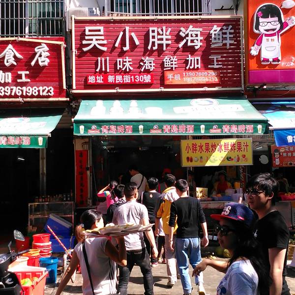 一定要为这家来点评一下,去三亚旅游的时候在网上搜到这家店,口碑相当不错,于是我们三亚的第一晚就决定去试一下三亚有名的海鲜加工市场,第一市场,选择了吴小胖海鲜加工。海鲜是我们打电话之后那边来了一个员...一定要为这家来点评一下,去三亚旅游的时候在网上搜到这家店,口碑相当不错,于是我们三亚的第一晚就决定去试一下三亚有名的海鲜加工市场,第一市场,选择了吴小胖海鲜加工。海鲜是我们打电话之后那边来了一个员工带我们去买的,夸一下那位小哥,态度超级好,还帮我们跟商贩还价,服务很周到。然后我们就拎着一包包海鲜来到了阿浪的店。满满得都是人,等待得时候看到门口有炒冰,就买了一份,纯芒果肉打成泥再炒,非常实在,离开之后在没吃过那么好吃得芒果冰。回归正题,他们家做的是川味口味的,口感相当好,酱汁更是美味。我们买了两只蟹做成蟹粥,非常得鲜美。个人特别推荐鲍鱼,那个美味让我到现在还是很想念。