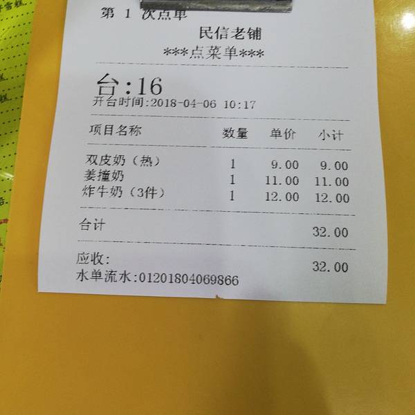 这家老铺在凤城食都,民信有很多家分店,去时店里基本没有什么人,店看上去也很旧,其实之前在其他分店吃过好几次了,姜汁撞奶姜味挺浓郁,很喜欢!