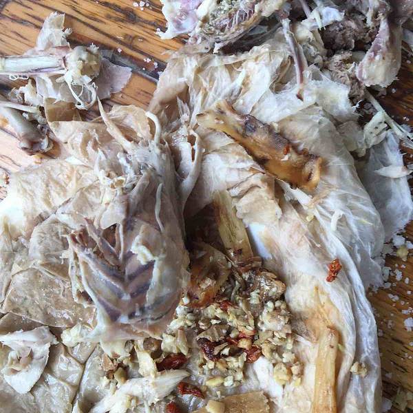 热腾腾的鸡从一堆粗盐中拿出来,清香扑鼻。鸡肉很入味,软糯不柴,口感特别好,配点白粥,咸菜,一人可以消灭一只。我们7个人点了三只,花了190元,大家都吃得饱饱的,回味无穷!