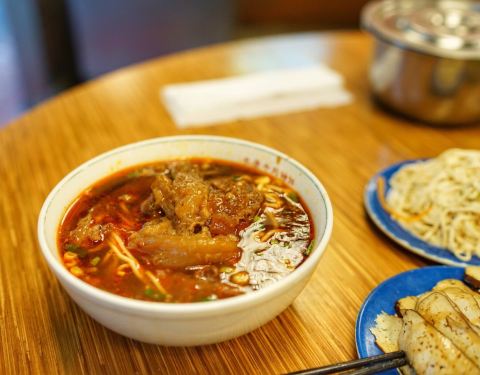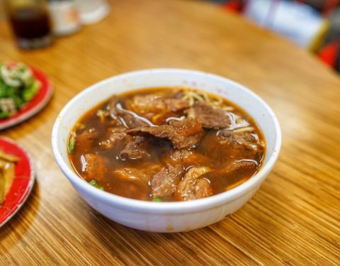 - 牛肉面其实面还好,但是他家的牛肉和牛筋做的很不错,分量很足,再拿了几个小菜,点上每桌都有的一笼...