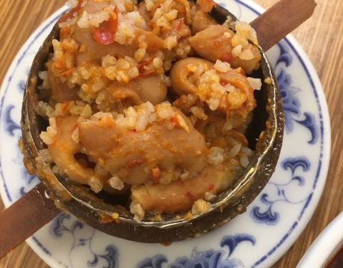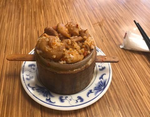 我的舊愛“永康牛肉麵”,湯頭鹹香辣,六大塊的牛肉分佈著均勻的牛筋,軟而不爛,小碗的台幣220元。粉蒸肥肠我每到必點,120元。