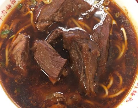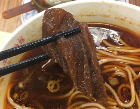- 我的舊愛“永康牛肉麵”,湯頭鹹香辣,六大塊的牛肉分佈著均勻的牛筋,軟而不爛,小碗的台幣220元