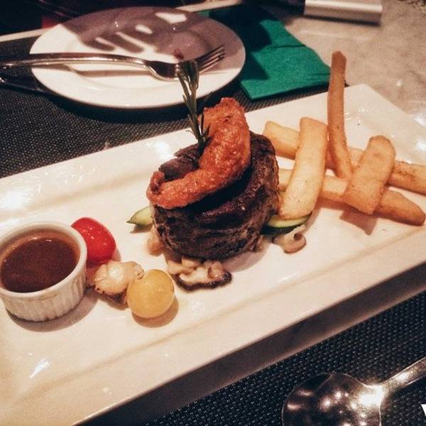 - 但至于情调是满分了,味道只是整体不错,牛扒肉质不是很好,后来单点的薄饼洋葱略多有点辣口,稍微扣分