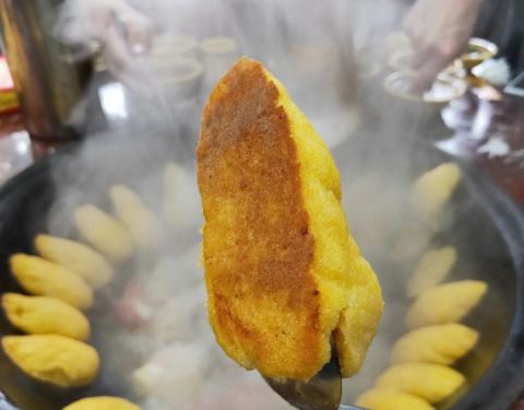 还有东北特色的玉米面锅贴,口感松软,趁热吃最好。PS:铁锅需要提前预定