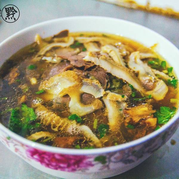 贵阳的牛肉粉可谓是贵阳一绝,所以到这边不来一碗枉来贵阳啊。 老贵阳全牛肉粉,离我们住宿的地方很近,都是属于胡同里的当地特色,他家的生意异常火爆,每天早上一到饭点儿,他家店前总是排起长龙,场面那叫一个热闹,据说已经开了十二、三年,做的东西都是真材实料。 上桌后先喝一口汤感受最纯正的鲜味。粉里面要放牛肉片和牛肉块,牛肉块是炖过的,软烂入味,他家的牛皮做得软Q,有嚼劲,吃到嘴里,回味无穷。