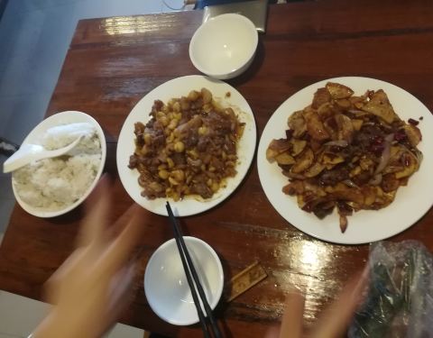 老板娘比较爽朗,在门口迎客:十二年的老店,味道很好,没吃到我家吃,我老公做菜很好吃~。我是两点多到店的,店里只有一桌,看那桌人吃的倒是心满意足,我只点了一份干烧土豆牛肉,店员好像有点小失望,可能现在老店的生意不如那些新兴的店铺好吧,那些游客从天南海北跑过来,吃个武汉的周黑鸭、重庆的小面、甚至是肯德基,真搞不懂怎么想的,总之,强烈推荐这家店!