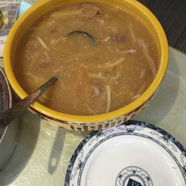 午饭在弟弟推荐的这家吃的,1点多了人还是很多。特色烤鸭饼是绿的。肚丝蒜汤,有点咸,配米饭吃