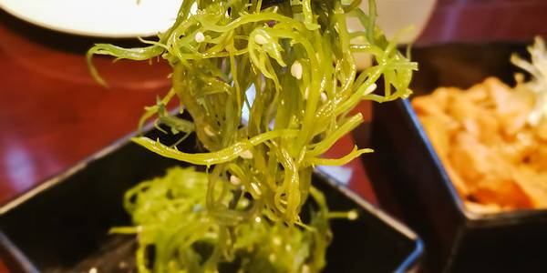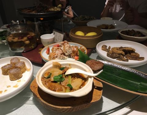 晓港公园里的禅意茶素,环境清幽,透着一丝禅意。前菜是海草、台湾泡黄姜、萝卜;主菜是罗汉上素、水芹木耳、福果支竹浸时蔬。酸菜和黄豆搭配,清爽带着甘香。