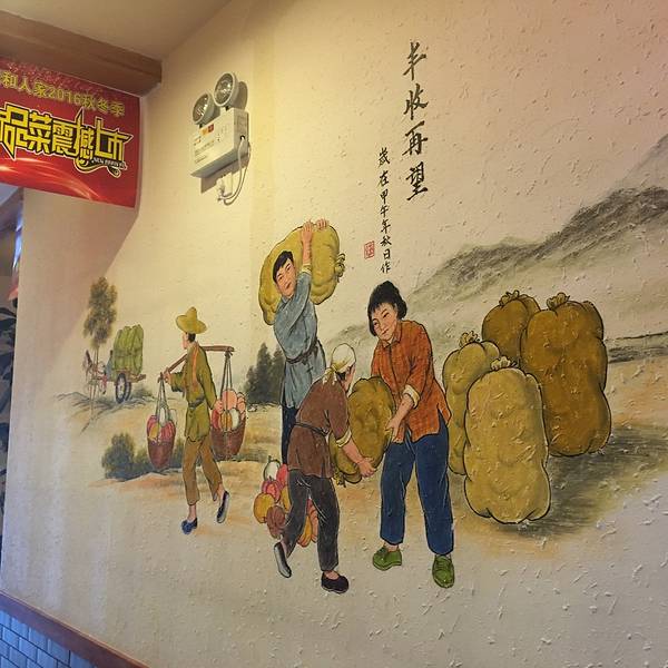在这个气派的城里吃了顿午饭,饭店里的农民画和标语都很有趣,洗手间门口的墙上,还写着“我们的地面是用毛巾打理的请您监督”,真是佩服这么有用心又有勇气的饭店。饭店生意很好,我们过了饭点吃饭,店里仍有很多客人。在这儿,意犹未尽的我们又点了炖羊肉,菜名也很有趣,叫“四姐夫炖阿尔巴斯山羊肉”。