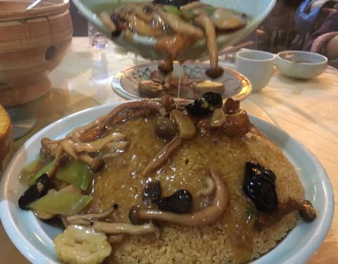 陕南桂花凉糕,香甜的桂花,润滑的糯米,是一道非常不错的中式甜品。 葫芦鸡,鸡肉非常嫩,外形很酥脆,造型很优美。 陕西锅巴三鲜,锅巴搭配菌菇意外好吃。 青椒黄辣丁,用料扎实,炖煮的很入味。