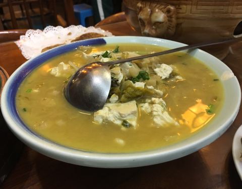 推荐的葫芦鸡味道蛮好,皮很香脆,木桶豆花,茴香软饼也不错呢,环境还可以,来的点错开饭点,人还不算很多,不过依然有点吵,菜量真的大,回国第二顿两个人140吃不完还得打包,国外一顿吃了700+也只是刚吃饱,默...
