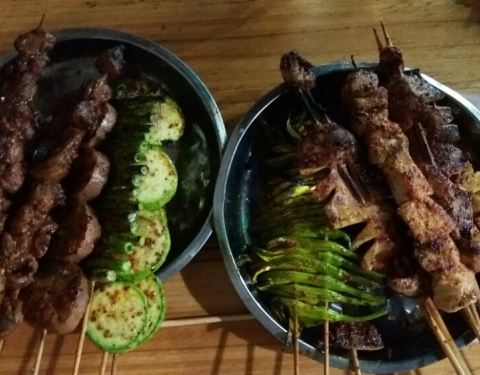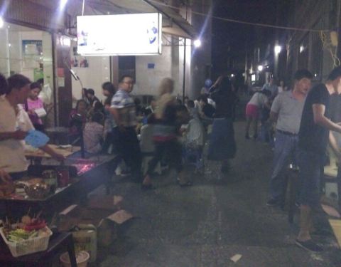 在竹叶轩丽娃国际艺栈的小巷不远处,有一家古城内比较出名的烧烤摊——阿毛烧烤。这家烧烤店谢霆锋当年在录制《十二道锋味》时有过光顾,这是一家清真店,所以烤的只有牛肉和羊肉,一大串牛腱子肉只要5块钱,可以说是相当地物美价廉,虽说上菜有点慢,但还是值得一来的。