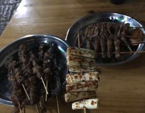 烧烤的口味比较辣,烤的糯米藕和草芽算是本地特色,感觉与四川的烧烤没什么差别,还不如去街边的小摊上烤当地的小豆腐块好吃,第三张照片就是在街边随便找的一家烧烤店,与店老板边吹牛边吃烤豆腐,也挺有意思的...