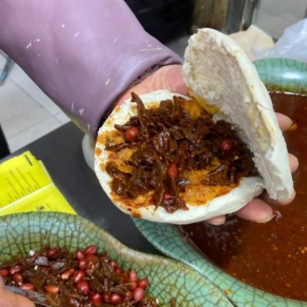 在西安不吃肉夹馍,那就算不上去过西安了。这家西安肉夹馍界的网红店,是当地人的心尖尖。门口只摆一张桌子,上面搁着玻璃柜,里面依次摆着鸭蛋黄、油炸花生米、玫瑰咸菜、煎鸡蛋以及酱料。只要有人来,店家便会熟练地从屋里锅灶上拿出一个热腾腾的馍,三下两下地加入客人喜欢的食材,此时肉夹馍也变得肉鼓鼓的,样子很是可爱,一口下去,只有满足了。