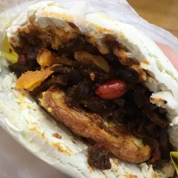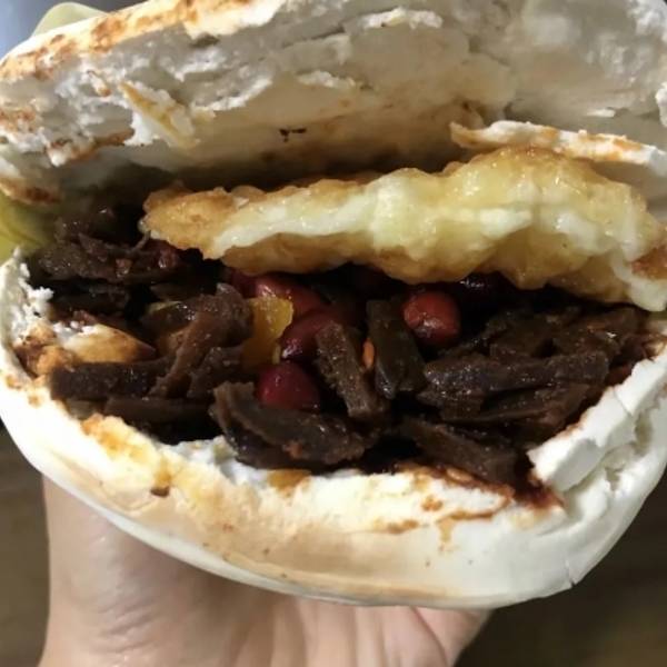 - 馍里边馅料还是非常多的,有小咸菜、花生、煎蛋、咸蛋黄,咸蛋黄味道也不是奇怪,就是馍有些许的干巴...