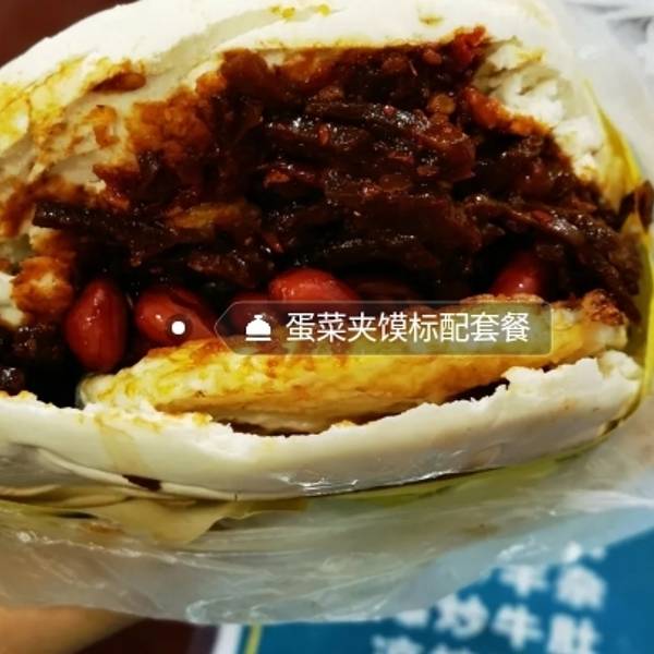 瓷选择了特色蛋菜夹馍,馍里边馅料还是非常多的,有小咸菜、花生、煎蛋、咸蛋黄,咸蛋黄味道也不是奇怪,就是馍有些许的干巴,但可以接受 赀是值得打卡的一家店
