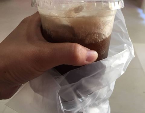 1元买的跳舞西西,喝起来口感还可以吧,可乐上面加了点奶油,我觉得没有纯可乐好喝
