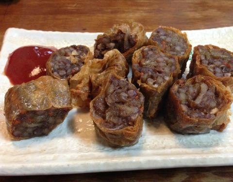 一早来到菁桐,好饿,所以去吃了杨家鸡卷。 这家店很有意思,鸡卷没有鸡,肉羹不勾芡。点了鸡卷,50台币一份。 老伯伯做好之后,给我们端上来的。份量中等,外面炸的酥脆,里面是素菜,蘸着番茄酱吃。总体很新奇,听说是曾经这边家境不殷实的人吃的,缅怀过去的古早味。