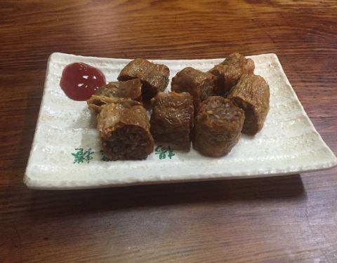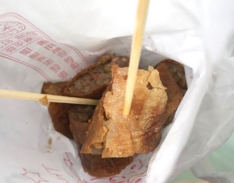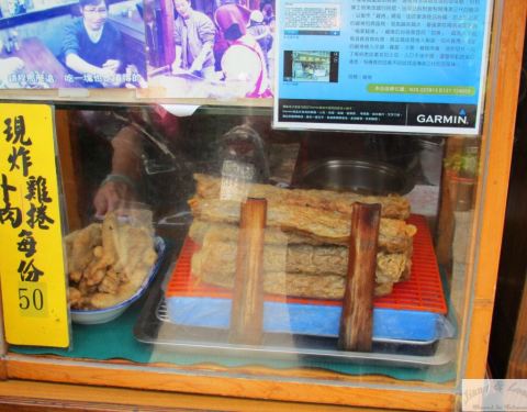 被店外的广告吸引着,就进去尝尝。鸡卷是手工做,小份卖50台币,但鸡卷並没有鸡肉成份,主要材料是猪肉和芋头。听说这名字已经流传了好久。吃下去很松脆,是不错的小吃。