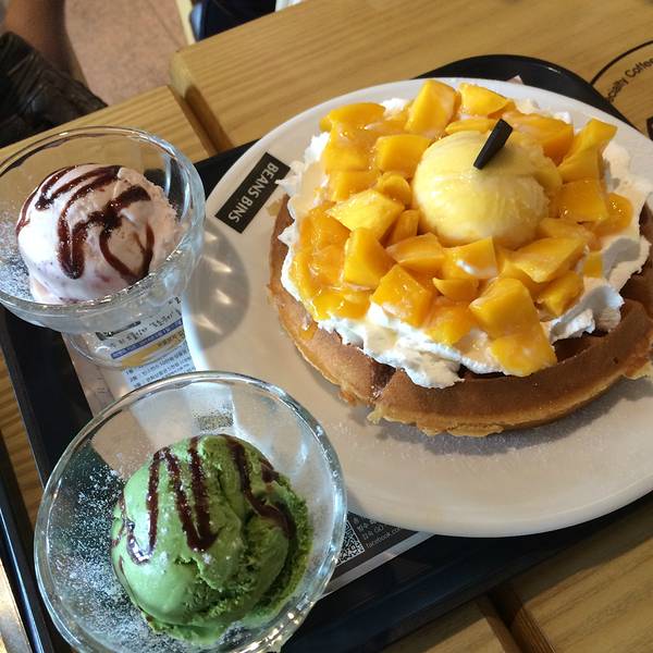 BeansBins的冰淇淋华夫饼有两个奶油球、香蕉、蓝莓等水果,还有两个冰淇淋球,可以从草莓、抹茶、巧克力、芒果和香草五种口味里面任选,端上来视觉效果就已经非常好了。