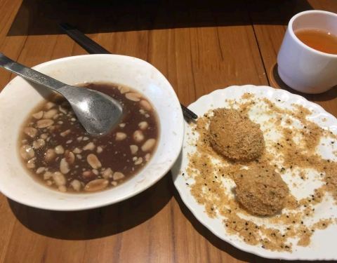 - 麻薯非常软糯一口咬下去可以拉出好长的丝,粘上花生粉和白糖芝麻非常给力,甜汤点了花生汤圆,里面有...