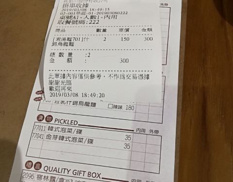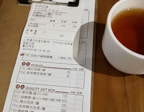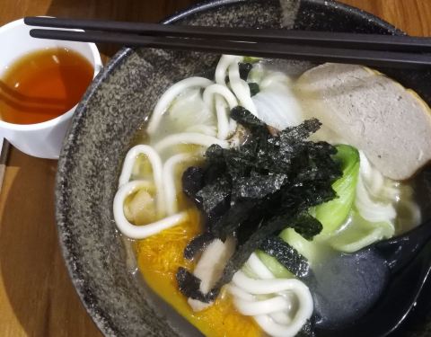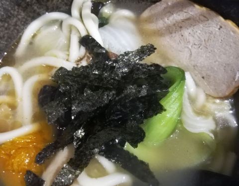 晚上从宁夏夜市回来,从捷运双连站出来,路上经过这家店,晚饭看见门口的招牌推荐杂锦乌冬面,又累又渴就吃个汤面吧。店铺不大,一楼一边是厨房一边靠墙有一列座椅,点餐后发现这家店的招牌是甜品——麻薯和刨冰,但俺们就选了汤面。看见别的桌上来的麻薯是干的,一颗挺大,上面撒了粉状的配料,估计是花生粉之类,用竹签叉住吃,对于俺口干的人来说一点也不吸引。乌冬面上来了,挺大一碗,蔬菜比较多——上海青、红萝卜、笋、南瓜、香菇等等,蔬菜都很好吃,还有一片类似豆干的,汤底还可以。乌冬面QQ的。 店门口还有个捐发票箱,俺就把前几天的发票都捐啦。