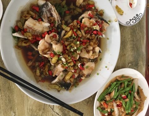 正宗的垛椒蒸鱼头,口味非常湘菜,两人点了一份鱼头,一份茄子炒豆角,一大盆米饭,吃得扶墙走,一共70元,环境一般,空调制冷效果不太好