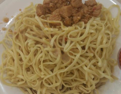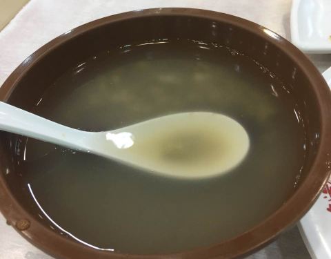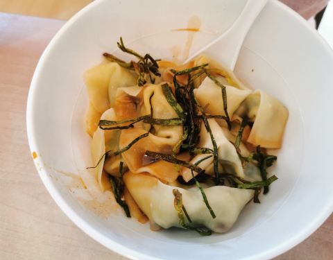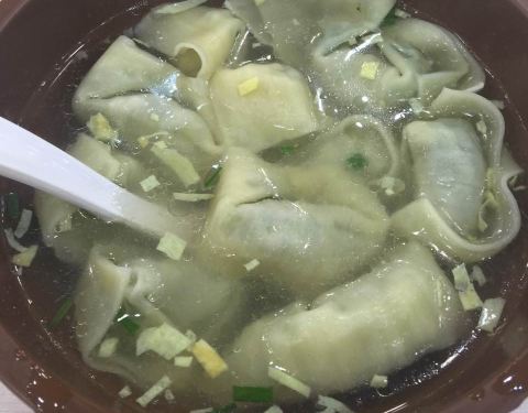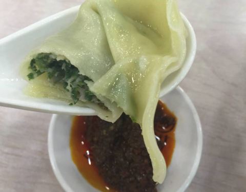 这个荠菜馄饨 入口香滑 回味无穷。尤其是沾上老盛昌独特的辣酱 真的是非常好吃。这个辣酱不是很辣 但是很香带有细微的甜味,配上混沌简直是绝配