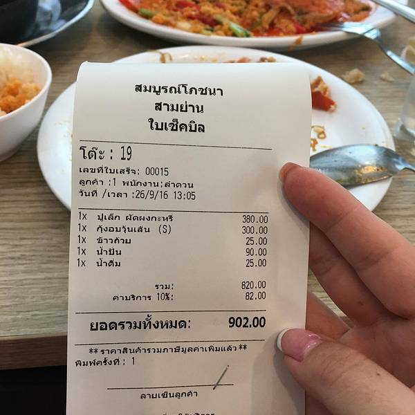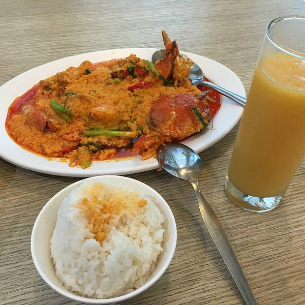 一大早起来是美好的一天,经过昨夜的奔波今天起不来也是正常的,睡到自然醒,慢慢悠悠收拾了一番,出去觅食。这就是我最爱的自由行……要记得防晒呀,雨伞随身带,外面真的很热…… 网上很多攻略里都提到这家饭店,海鲜吵得很火,不过服务我真的很失望,里面的顾客真的都是中!国!人!!!人均消费偏高 ,还有税费,我点了一份招牌咖喱蟹、河虾炒粉、一份米饭、一杯鲜榨果汁、一杯冰水,一共902珠,其实我点得有点多了,一个人吃的话一份小份的咖喱蟹就够了。 tips:1.这家饭店在曼谷有很多家分店,营业时间也是分段的,有得是中午营业,有的是傍晚营业,最好先在网上实时确定一下,不然大热天的去了却关门,岂不是很浪费时间很扫兴。我住的酒店附近就与一家,但是中午不营业,里面的员工小哥很热心地告诉我该去哪儿吃,因为语言不通,他不会英文,只能靠肢体语言和几个单词来沟通, 他给了我一张各分店的地图,在确定我知道了他的表达后,帮我叫了出租车,热情的人,谢谢。 2.咖喱蟹必点,做得不错。