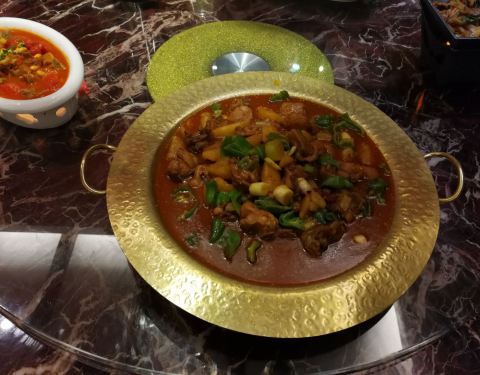 这里的大盘鸡是一个特色,看上去一个大铜盘装得满满的,有些西北部的特色,这里朋友聚餐是个不错的地...