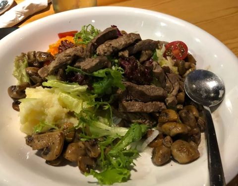 沙拉都是很大份的那种,而且口味也非常好,里面荤素搭配,点的是招牌传统巴伐利亚大沙拉,有混合生菜,椰菜,胡萝卜丝,白罗卜丝,土豆沙拉,小番茄,蘑菇,牛肉条。这么一大盘沙拉吃下去,很满足,各式菜点配上...沙拉都是很大份的那种,而且口味也非常好,里面荤素搭配,点的是招牌传统巴伐利亚大沙拉,有混合生菜,椰菜,胡萝卜丝,白罗卜丝,土豆沙拉,小番茄,蘑菇,牛肉条。这么一大盘沙拉吃下去,很满足,各式菜点配上酱汁,味道很赞!