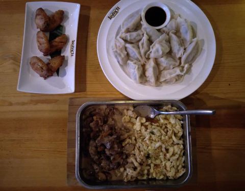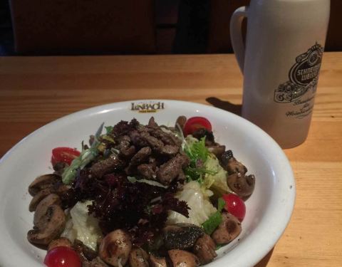 沙拉都是很大份的那种,而且口味也非常好,里面荤素搭配,点的是招牌传统巴伐利亚大沙拉,有混合生菜,椰菜,胡萝卜丝,白罗卜丝,土豆沙拉,小番茄,蘑菇,牛肉条。这么一大盘沙拉吃下去,很满足,各式菜点配上...
