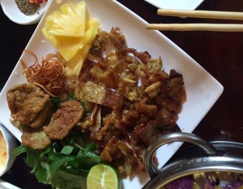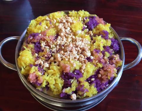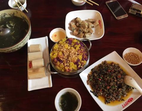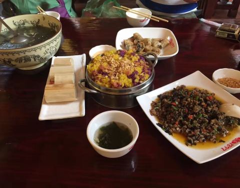 环境很棒,吃的东西比较精致,味道也符合我们的口味!点了一个竹筒饭、一个五彩米饭、一个烤香猪肉、4个小蒸卷、一个蝦饼、一个蝦卷、一个汤、一个紫苏炒鸡肉沫!四个人吃撑,个人觉得烤香猪肉差点,其他都很好,这个紫苏炒鸡肉沫很好吃!下饭必点,不过牙不好的要小心吃,里面有鸡骨一起宰的!价格也公道,一共255!