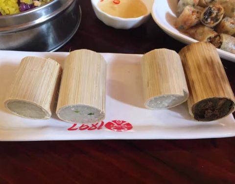 环境很棒,吃的东西比较精致,味道也符合我们的口味!点了一个竹筒饭、一个五彩米饭、一个烤香猪肉、4个小蒸卷、一个蝦饼、一个蝦卷、一个汤、一个紫苏炒鸡肉沫!四个人吃撑,个人觉得烤香猪肉差点,其他都很好,...