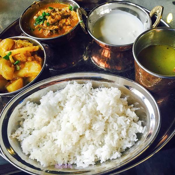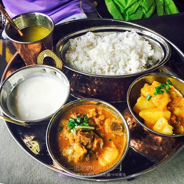 没事的时候来这边找个靠窗户的位置喝上一壶甜茶,看着楼下八廓街的行人,这就是慢拉萨生活的标配。这边的酱料比较溪,缺乏厚重的感觉。楠也变成了圆饼,火候欠一点。牛肉咖喱套餐,种类丰富些。鸡肉咖喱套餐。