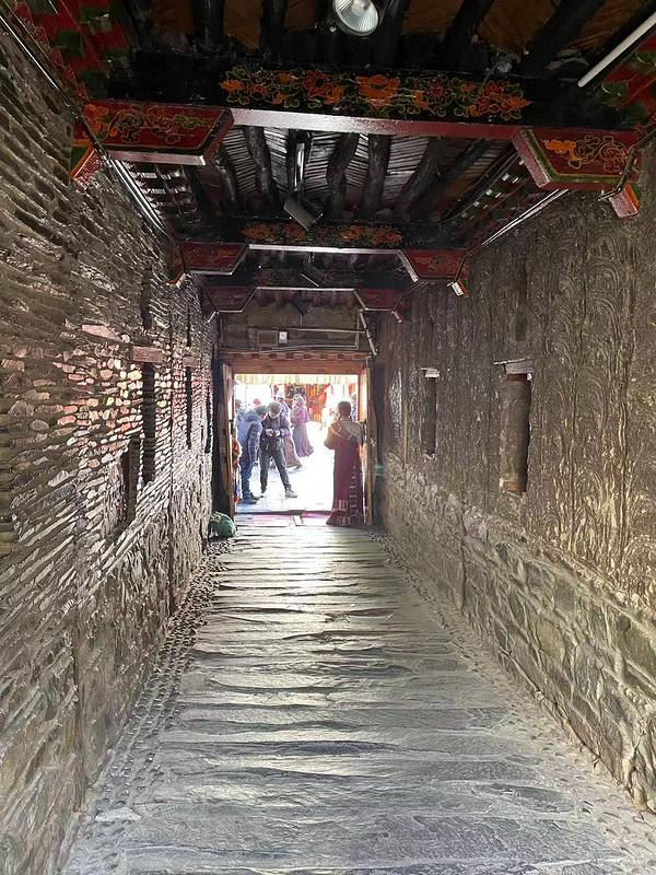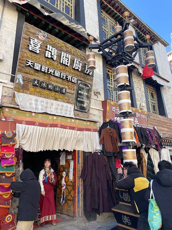 从玛吉阿米往西走,可以看到一棵大柳古树,传说这棵古树是当年文成公主所栽。古树的斜对面,有一个装饰比较厚重的门洞走廊,走廊里略暗,两侧雕刻着佛像,这里经常有穿着藏服的旅拍的人过来拍照,从门洞里进去,通往大院的路两边都是卖饰品和手工艺术品之类的店。出了门洞往右拐,上了楼梯,是喜鹊阁厨房了。