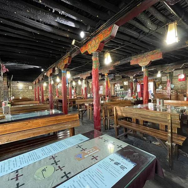 推开加卡厦大院古朴的大门,走进通道时才发现这里已与街外的吵闹与喧嚣暂时隔绝。拾级而上来到二楼的喜鹊阁厨房,坐在大堂内,临窗而坐品尝杯中的酥油茶,颇有些年头的木柱子和用阿嘎土筑成的地板让人依稀感受到藏式建筑的风貌。窗外还可以看到转经道上顺时针行走的虔诚信徒和斜对面粗壮的古树下凳椅上歇息的藏族阿妈。喜鹊阁厨房三楼扯着经幡旗,很有藏式特色。阳光充足的时候,可以到三楼来喝一壶甜茶,聊聊天,坐在上面看书、发呆,甚至回忆过往、憧憬未来,都是一件美好的事。