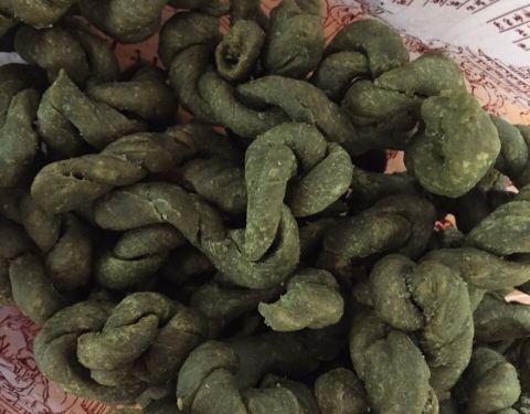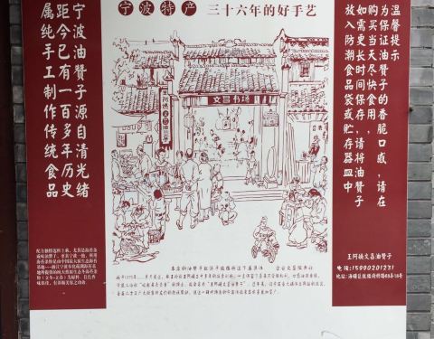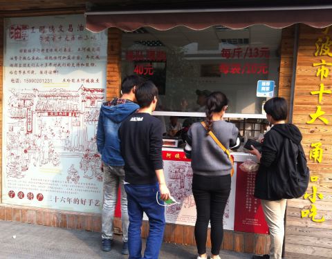这家店深藏于宁波鼓楼的某个小巷子里,也算是宁波名小吃了。每天都是门庭若市,要排很长的队才能买到,并且还规定排队者每人限购20元。有两种味道,黄色的是甜味的,绿色的是海苔咸味,海苔粉来自奉化莼湖的冬青海苔。由于生意好,现在又开了几家分店。