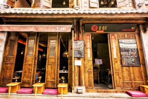 这是一家将地方特色与现代经营方式很好结合起来的餐厅,店里装修风格古朴,属于小资范儿,特别有情调。坐在床边,看着古城街,听着古城音乐,非常享受。餐厅食材均采自大理当地,有机种植的蔬菜,本地的家禽和洱海的生态鱼、蛙等,每道菜都能吃出当地的特色口味。