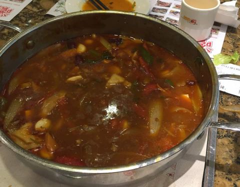 环境不错,选了六种组合拼锅,没点涮菜,担心吃不完浪费。等做好后一尝,虾肉和鱼肉都很嫩,很满意,每一样都很入味,就是大肠吃了几块后觉得很腻,吃到最后会觉得有点咸。
