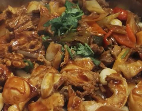 - ...挺大的,环境也很不错,有三黄鸡焖锅、变态辣牛蛙、黄记煌焖鸡腿肉、三汁焖牛肉粒等小吃,味道很不错
